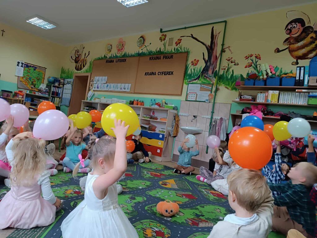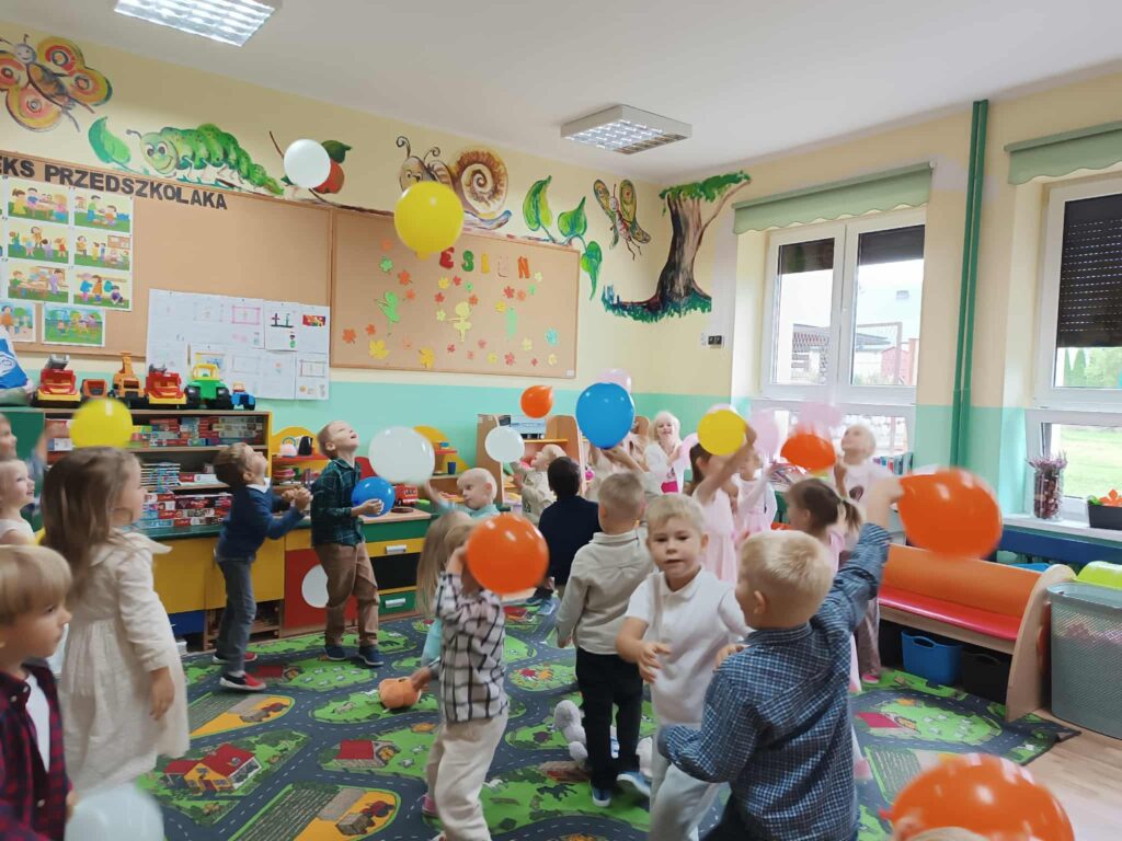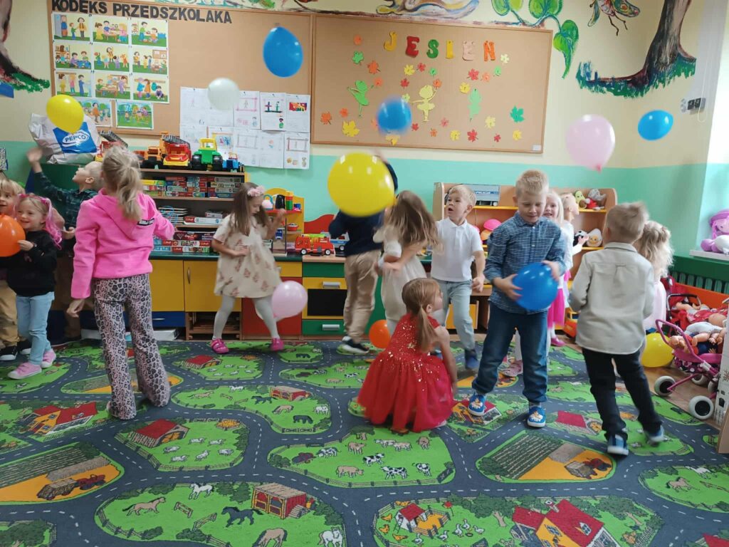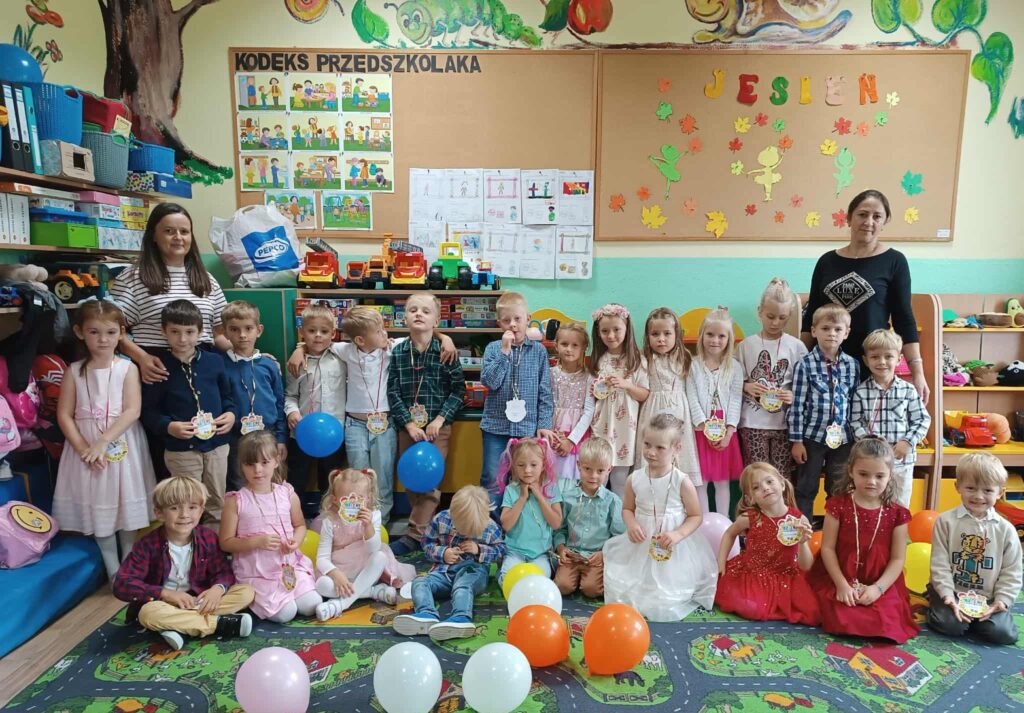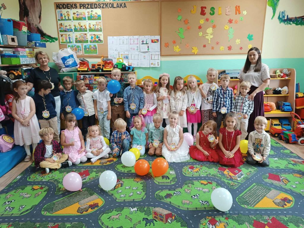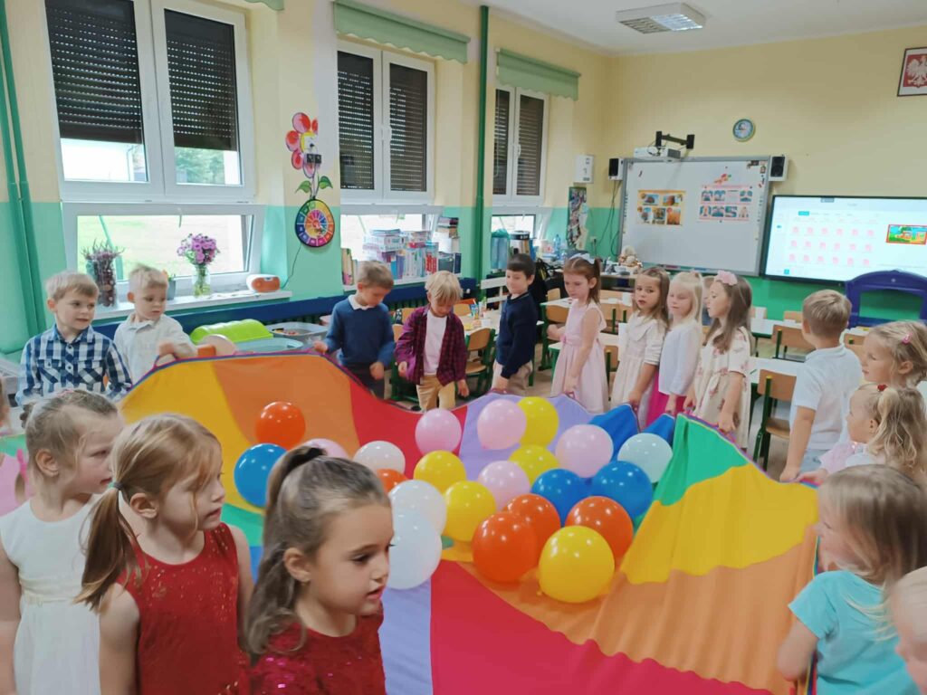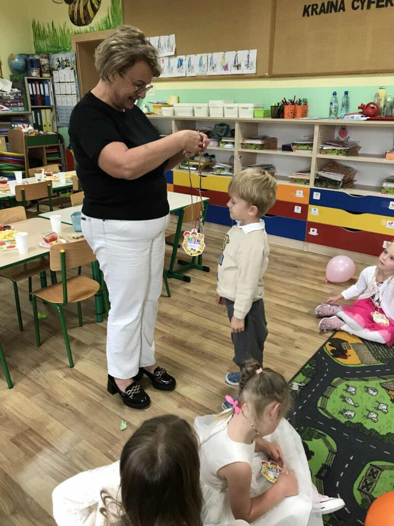 Wspólne zabawy i tańce z balonami, chustą Klanza, gumą sensoryczną sprawiły że każdy przedszkolak czuł się wyjątkowo. Najważniejszym jednak momentem było uroczyste wręczenie medali przez Panią Dyrektor . Każde dziecko otrzymało medal